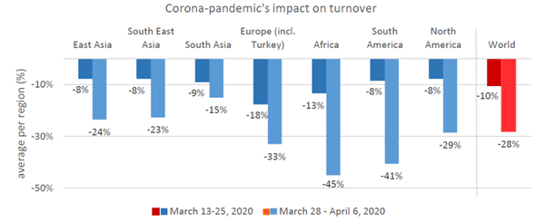 全球各地的公司預計,2020年的營業額將比2019年平均下降29%。這明顯低于第一次調查結果11%。