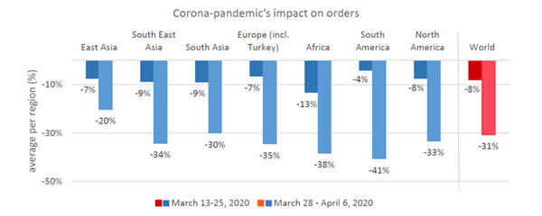 第二次國際紡聯新冠疫情影響調查的結果表明,自第一次調查以來,有更多的訂單被取消或推遲。全球訂單平均下降了32%,而在第一次調查中只有8%。
