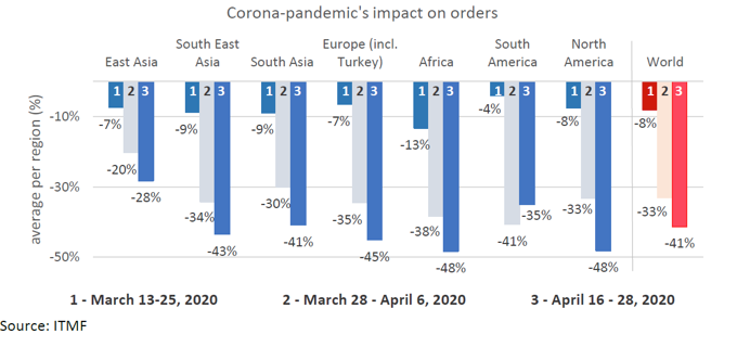 值得注意的是,東亞地區的訂單降幅為28%,明顯低于其他所有地區(41%及以上)。可以假設,這個地區首先受到新冠疫情帶來的影響,也首先從危機中恢復。特別是中國和韓國成功地控制了疫情,在過去的幾周里,大多數中國紡織企業都大幅提高了產量。同時,線下零售店也重新開張,東亞國家的消費開始逐步恢復。但是消費情況將如何變化,還有待進一步觀望。