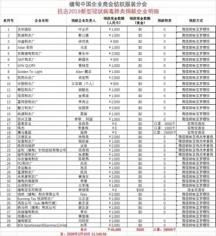 緬甸中國商會(huì)在1月27日即面向在緬中資企業(yè)發(fā)出了“緬甸中國企業(yè)商會(huì)支援祖國,抗擊新型冠狀病毒感染肺炎倡議書”,隨后成立了疫情防控和捐贈(zèng)協(xié)調(diào)工作小組,設(shè)定專人分工負(fù)責(zé)捐贈(zèng)事宜的協(xié)調(diào)和物資信息登記等工作。作為緬甸中國商會(huì)的主要分支機(jī)構(gòu),緬甸中國商會(huì)紡織服裝分會(huì)積極動(dòng)員會(huì)員企業(yè)捐款捐物。截至2月10日,緬甸中國企業(yè)商會(huì)紡織服裝分會(huì)共收到在緬中資紡織服裝企業(yè)的捐款將近人民幣5萬元,以及捐贈(zèng)口罩29000個(gè)。