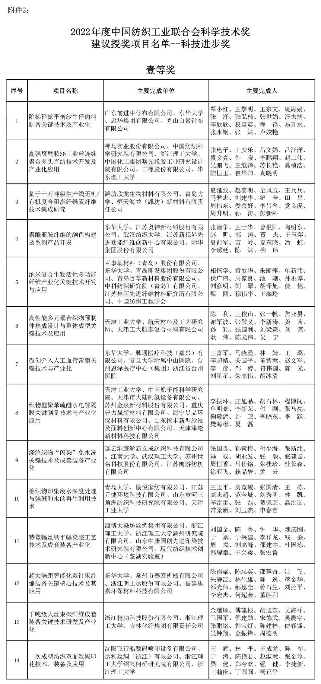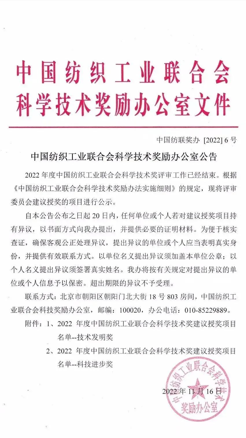 2022年中國紡織工業(yè)聯(lián)合會科學(xué)技術(shù)獎建議授獎項目公示