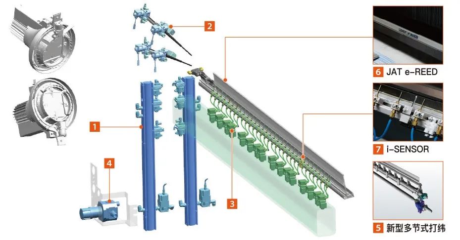 在綠色可持續日益受到行業關注的當下,紡織品生產過程中的節能降耗以及資源利用率的提高依然成為衡量設備技術創新發展水平的指標之一,本屆展會展出的織造裝備更加契合展會“可持續性與循環性”的主流方向。一方面,對設備結構與性能進行優化,使其耗電量、耗氣量等進一步降低,達到節能降耗的目的,豐田的JAT 910通過優化引緯噴嘴系統,較以往機型空氣消耗量減少了20%,空氣壓力減少了10%;津田駒的ZAX001neo較以往機型,空氣消耗量可減少35%、壓力降低20%;必佳樂、意達、多尼爾、TOYOTA等的產品都使用了直接驅動馬達,機器節能高效,JAT 910新型主馬達逆變器的采用,使設備的耗電量減少了10%。另一方面,針對原料的可持續性,廢邊節省技術的推出具有重要意義,尤其是對于蠶絲等貴重纖維可起到大幅節省成本的作用。意達的iSAVE®能夠完全消除左側的廢邊,顯著減少了原材料的浪費;必佳樂織機左側配備EcoFill消除左側廢邊裝置,降低了高檔緯紗的浪費;絲冪拓推出的2SAVE廢邊處理裝置,最大程度減少廢邊紗,甚至左右兩邊的廢邊經紗全部取消,織造幅寬最多可增加50 mm。此外,回收再生材料的應用熱潮興起,織造裝備也針對再生纖維的特性進行了相應的優化,必佳樂的Ultimax劍桿織機,針對再生紗飛花落棉較多的特點,機身橫梁傾的設計斜度加大,有利于飛花落棉沉降;約科布•繆勒也聲明了回收紗線和可生物降解紗線在其設備上的生產適用性。