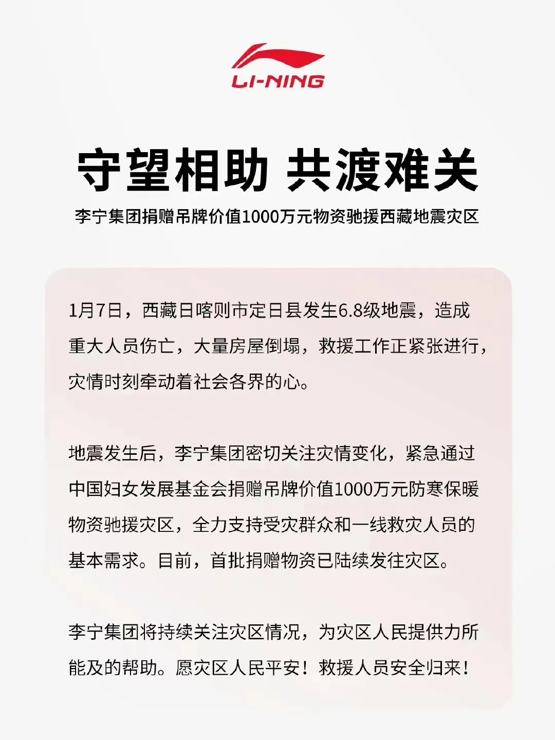 波司登集團將持續關注災區情況,在政府部門的指導下,為災區人民和救援工作提供更多的幫助與力量。祈愿西藏災區早日恢復正常生活!
