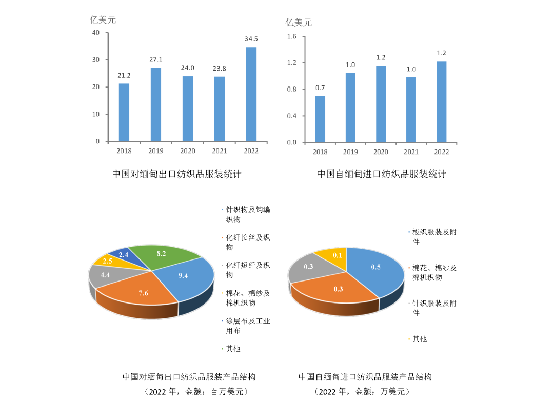 近年來,中國與緬甸紡織品服裝貿(mào)易規(guī)模穩(wěn)中有升,中國連續(xù)多年成為緬甸第一大紡織品服裝貿(mào)易伙伴和第一大進口來源國。根據(jù)中國海關(guān)數(shù)據(jù),2022年中緬雙邊紡織品服裝貿(mào)易總額達35.7億美元,其中,中國對緬甸紡織品服裝出口金額為34.5億美元,主要出口產(chǎn)品包括針織物及鉤編織物(9.4億美元,占比27.2%)、化纖長絲及織物(7.6億美元,占比22%)、化纖短纖及織物(4.4億美元,占比12.8%)、棉紗及機織物(2.5億美元,占比7.2%)和浸漬、涂布、包覆織物等(2.4億美元,占比7%)。2022年,中國自緬甸進口纖維原料、紡織品服裝金額為1.2億美元,主要進口產(chǎn)品為服裝及衣著附件(合計0.8億美元)、棉紗及機織物(0.3億美元)等。