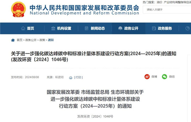國家發(fā)展改革委、市場監(jiān)管總局、生態(tài)環(huán)境部聯(lián)合發(fā)布《關(guān)于進一步強化碳達峰碳中和標準計量體系建設(shè)行動方案(2024—2025年)》的通知。