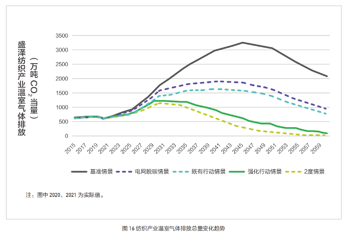 盛澤紡織產業氣候行動目標和路徑得以明確。基于情景分析結果,考慮國家雙碳目標、地方達峰任務要求和盛澤紡織產業發展規劃,盛澤可選強化行動情景路徑為紡織產業氣候行動路徑。該情景下,紡織產業溫室氣體排放量將在2029年實現達峰,峰值水平為1214.6萬噸二氧化碳當量,平臺期為2029到2035年,中和時間為2058年,排放量控制在150萬噸二氧化碳當量以下。為實現上述目標,盛澤應制定實施紡織產業綠色低碳轉型行動計劃,建設以高效、綠色、循環、低碳為特征的現代紡織產業體系,實現高質量、可持續發展。可重點圍繞能源消費低碳轉型、構建綠色低碳產業體系、增強綠色技術創新能力、著力培育綠色低碳品牌等方面采取有力舉措。