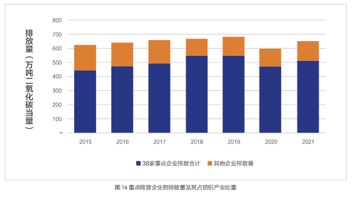 2015至2021年間,三種能源消費產生的溫室氣體排放量之和占集群總排放量比重保持在96%以上。四是排放呈現出較強聚集性。在產業分布上,2021年紡織業和化學纖維制造業的排放量分別占集群比重的61.43%、38.42%。在企業分布上,38家企業的排放量之和占集群比重的80%以上。