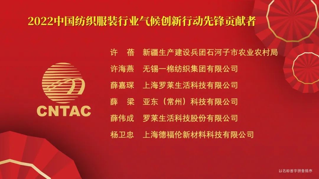 在12月29日舉行的2022年中國紡織大會上,中國紡織工業聯合會對55家“中國紡織服裝行業氣候創新行動先鋒單位”和65位“中國紡織服裝行業氣候創新行動先鋒貢獻者”進行了通報表揚。