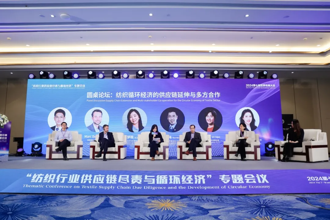 紡織循環(huán)經(jīng)濟對諸多利益相關(guān)方都會產(chǎn)生深遠影響,各方需要合作以治理供應(yīng)鏈延伸帶來的相關(guān)風險,促進循環(huán)經(jīng)濟的發(fā)展。在“紡織循環(huán)經(jīng)濟的供應(yīng)鏈延伸與多方合作”圓桌對話環(huán)節(jié),由清華大學環(huán)境學院長聘教授、博士生導師溫宗國主持,來自的德國國際合作機構(gòu)(GIZ)FABRIC項目主任Marc Beckmann、經(jīng)濟合作與發(fā)展組織(OECD)政策研究員倪夢薇、世界自然基金會(WWF)上海區(qū)域項目主任任文偉、中國紡織工業(yè)聯(lián)合會社會責任辦公室LCA研究總監(jiān)孫麗蓉、FSC中國市場發(fā)展總監(jiān)吳德君等嘉賓,分別就循環(huán)經(jīng)濟給傳統(tǒng)的紡織供應(yīng)鏈帶來的延伸變化、紡織循環(huán)經(jīng)濟的供應(yīng)鏈延伸如何影響各方的利益、風險與責任,以及國內(nèi)外政策制定者如何促進業(yè)界在循環(huán)經(jīng)濟領(lǐng)域的有效合作等熱點話題展開深入探討和交流。