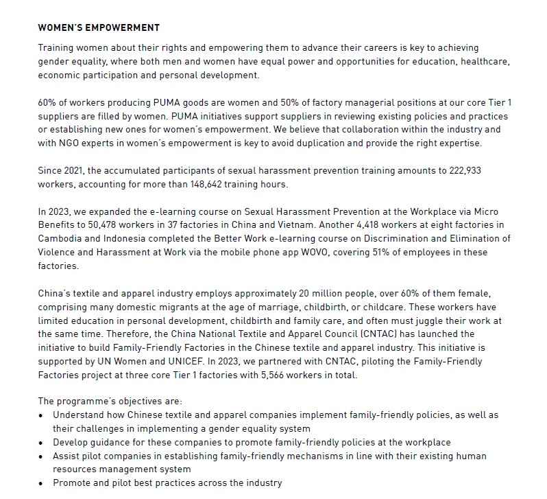 FFF項目自2022年推出以來,首期試點(diǎn)項目共計有5家知名品牌,與其優(yōu)質(zhì)供應(yīng)商工廠中的11家佼佼者參與并完成相關(guān)調(diào)研、培訓(xùn)、管理制度優(yōu)化等FFF相關(guān)實(shí)踐工作,試點(diǎn)項目于2024年8月完滿收官,為行業(yè)多家國際品牌及供應(yīng)鏈企業(yè)帶來積極影響。PUMA在2023年報中對參與FFF試點(diǎn)項目的計劃、目標(biāo)、工作內(nèi)容以及相關(guān)數(shù)據(jù)進(jìn)行了全面披露,覆蓋3家核心一級工廠,涉及員工數(shù)量5566人。本月初,H&M旗下品牌COS在《性別平等年度進(jìn)展報告》中披露其供應(yīng)鏈工廠參與FFF試點(diǎn)項目。這一認(rèn)可凸顯了FFF試點(diǎn)項目在促進(jìn)推動供應(yīng)鏈性別平等方面所產(chǎn)生的重大影響。此外,項目也被列入瑞典品牌LINDEX近日發(fā)布的《2024人權(quán)報告》,報告指出,F(xiàn)FF有助于“創(chuàng)造包容性的工作場所,為婦女提供平等的發(fā)展機(jī)會”。由此可見,F(xiàn)FF項目在推動全球供應(yīng)鏈性別平等方面獲得了令人矚目的成果。